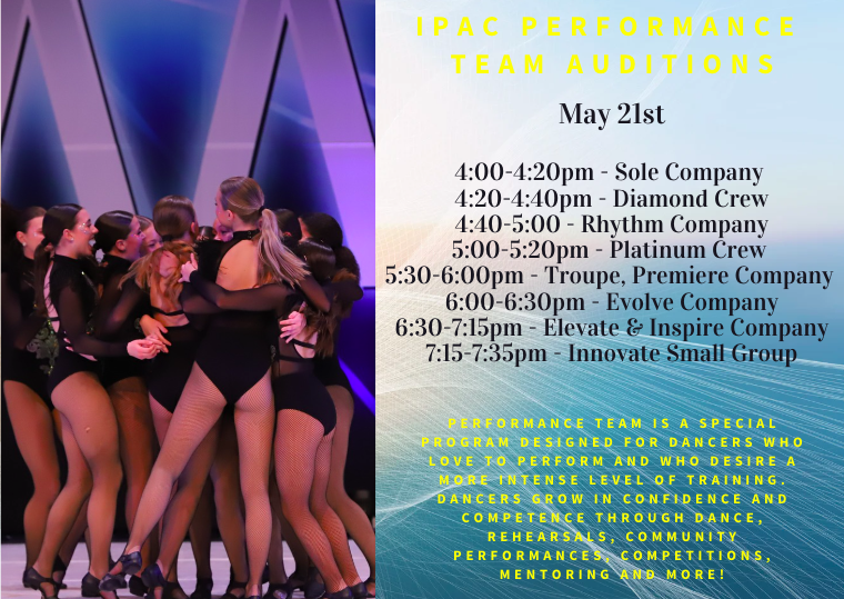 IPAC Performance Teams are designed for those students who want to take their dancing to the next level. Dancers have more performance opportunities throughout the season at local competitions and conventions. Dancers spend their class time advancing their technical skills while promoting teamwork, goal reaching, and self-esteem.